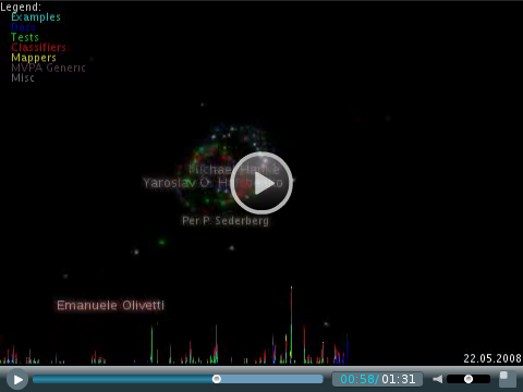In the movie, each file in the PyMVPA sources that is changed appears as a particle on the screen centered around the name of the developer that contributed this change. The colors indicate which part of PyMVPA the respective file belongs to (see the legend on the left). The animation is regenerated every couple of weeks to include the more recent commits.